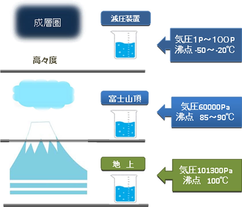 理由;水は100℃で沸騰するが、気圧が低くなると沸点も下がる。